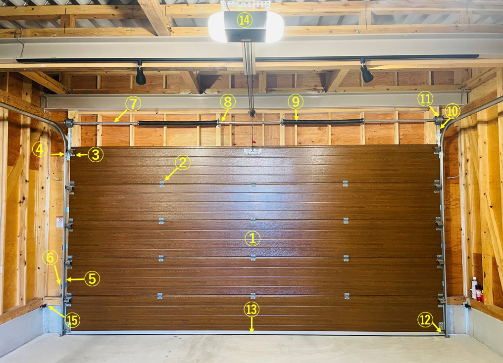 ⑬ウェザーストリップ…一番下部のパネルについて地面とパネルの間から雨やゴミが入らないようにする部材